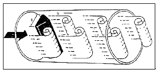 在流體中設置非流線型旋渦發(fā)生體(阻流體),則從旋渦發(fā)生體兩側交替地產生兩列有規(guī)則的旋渦,這種旋渦稱為卡門渦街,如圖(一)所示。
